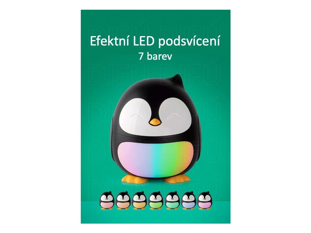DIFÚ Penguin-1 je roztomilý zvlhčovač vzduchu a difuzér vonných esencí ve tvaru tučňáka s funkcí ambientního osvětlení a reproduktorem s 10 relaxačními nahrávkami.