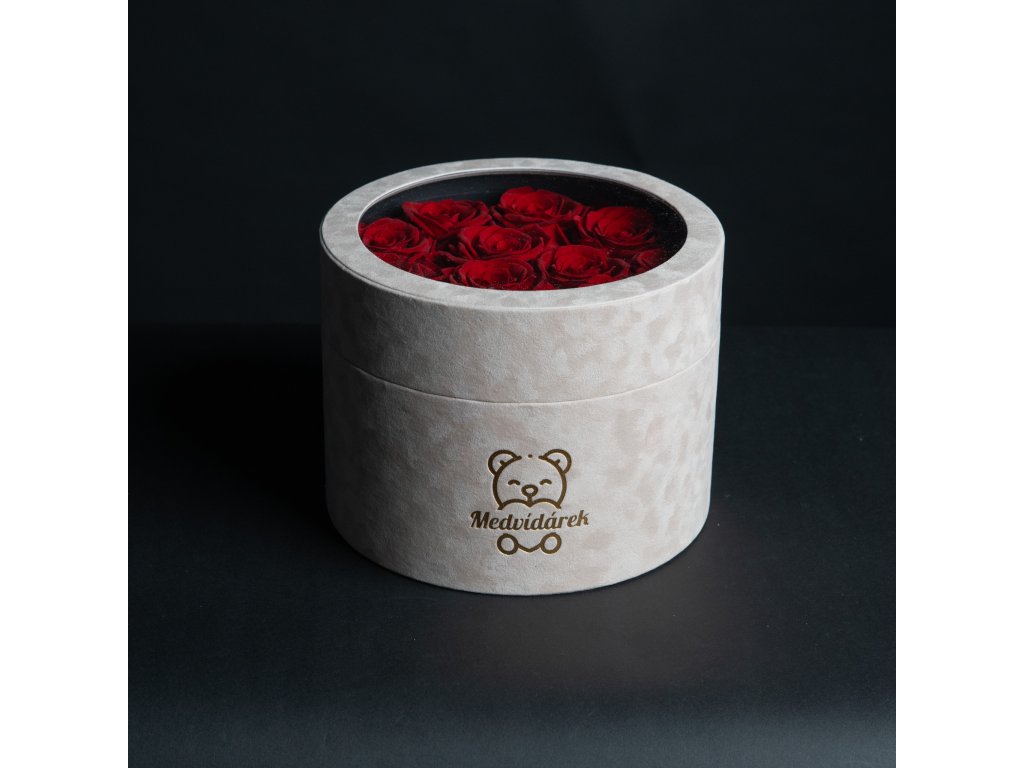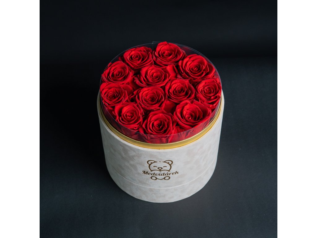 Dvanáct růží je absolutní klasikou ve světě romantiky. V našem podání však tato klasika vydrží roky, ne jen týden. Tento střední box je zlatým středem naší nabídky – dostatečně velký na to, aby ohromil, a přitom stále elegantně kompaktní. Růže jsou precizně naaranžovány do tvaru dokonalé kupole v prémiovém boxu s logem Medvídárek. Je to ideální dárek k výročí, Valentýnu nebo narozeninám