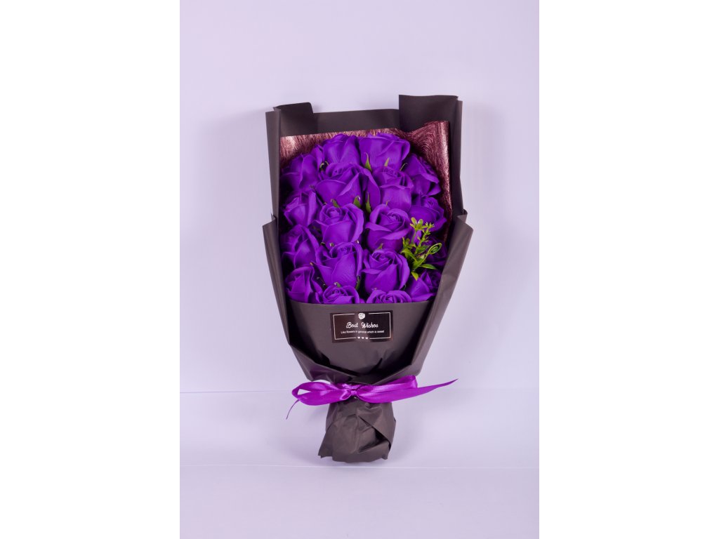 Medvídárek fialový puget z mýdlových růží v dárkovém boxu