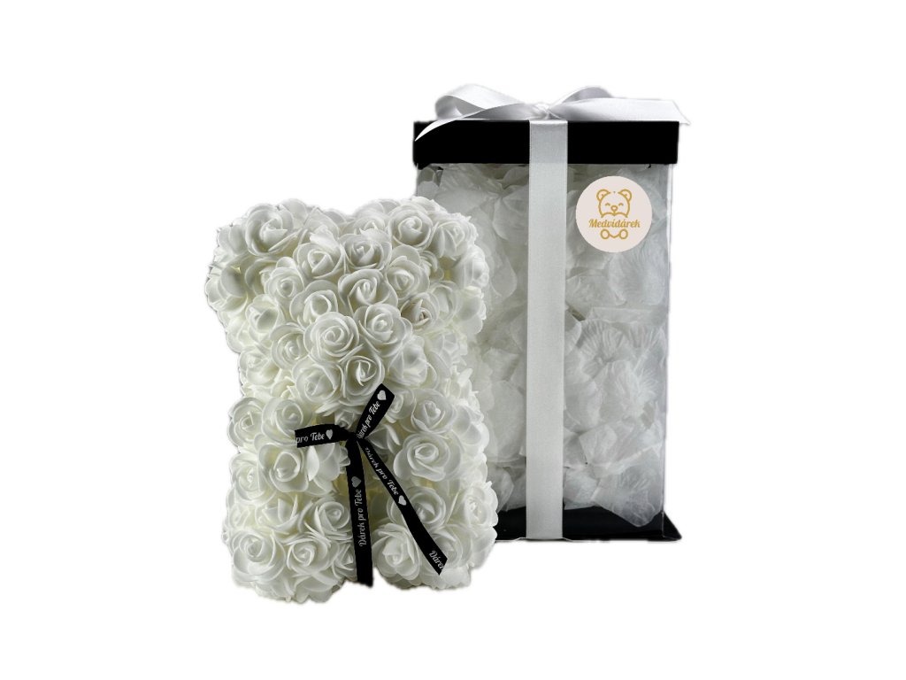 MEDVÍDÁREK Romantic je parfémovaný medvídek z růží ve velikosti 25cm zasypaný bílými okvětními lístky a zavázaný luxusní bílou stuhou. Medvídek z růží Romantic je ideálním dárkem pro ženu na Valentýna, narozeniny, výročí či MDŽ.