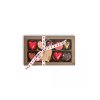 V krabičce jsou připravena srdíčka, která se rozplývají na jazyku. Pochutnáte si na jahodě, malině, kokosu, lískooříškovém nugátu v červeném srdíčku a jahodovém lanýži obaleném v ruby čokoládě.
